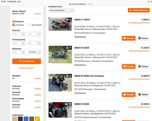 wie der Titel schon sagt bin ich auf der suche nach einer bezahlbaren K1300R mit Vollausstattung und am liebsten Koffern usw dazu. Im Idealfall unter 30tsd km und um München herum. Kann wenn das Angebot passt aber auch weiter weg sein. Abholung ist möglich.