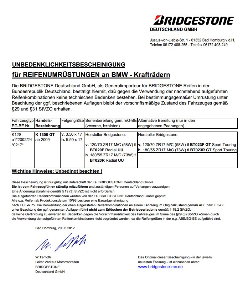 Freigabe Bridgestone BT 020 und BT023GT für K 1300 GT