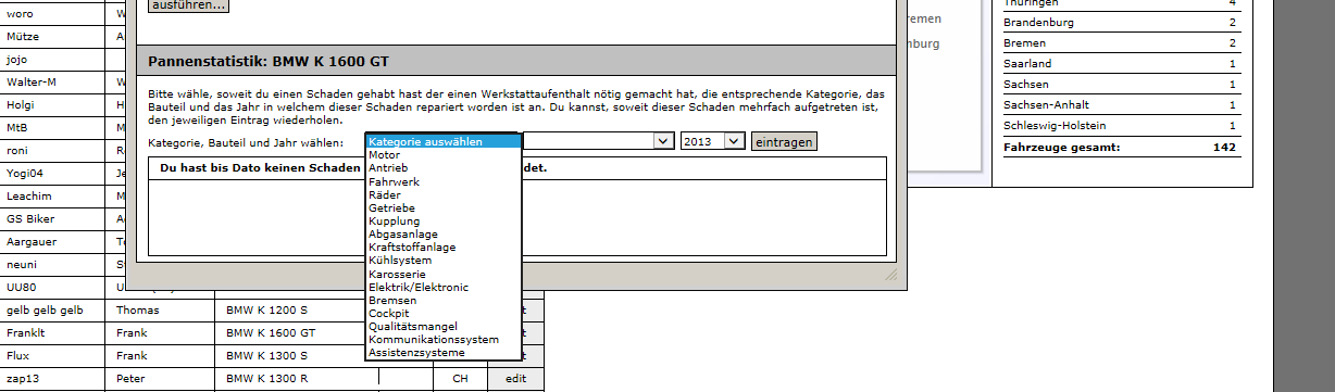 Es gibt hier zwar 7611 User, aber Fakt ist doch das vielleicht noch zwanzig K1200/K1300 Fahrer wirklich aktiv sind und sich eventuell an einer Statistik beteiligen würden.