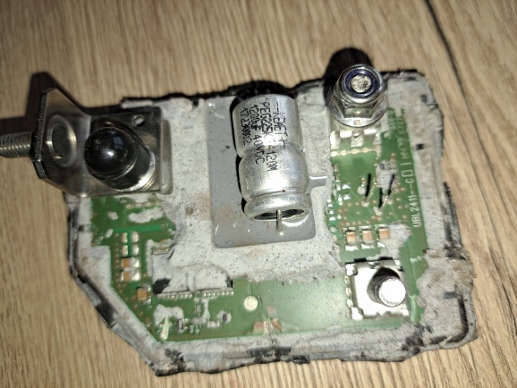 Und damit das da drin nicht herumwackelt ist das für die Ewigkeit eingegossen. Klassische Elektronikbauteile wie Leiterplatte, IC, Dioden, Transistoren, Kondensatoren, Widerstände, etc. werden da vermutlich nicht drin sein.