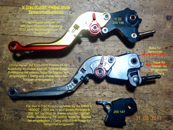 Fa.Motea liefert seit Jahren V-Trec Hebel für die BMW K1600 GT/GTL aus, deren Adapter auf der Kupplungsseite keine Nase zur Betätigung des Microschalters für das Beenden des Tempomats nach gezogener Kupplung aufweist!
