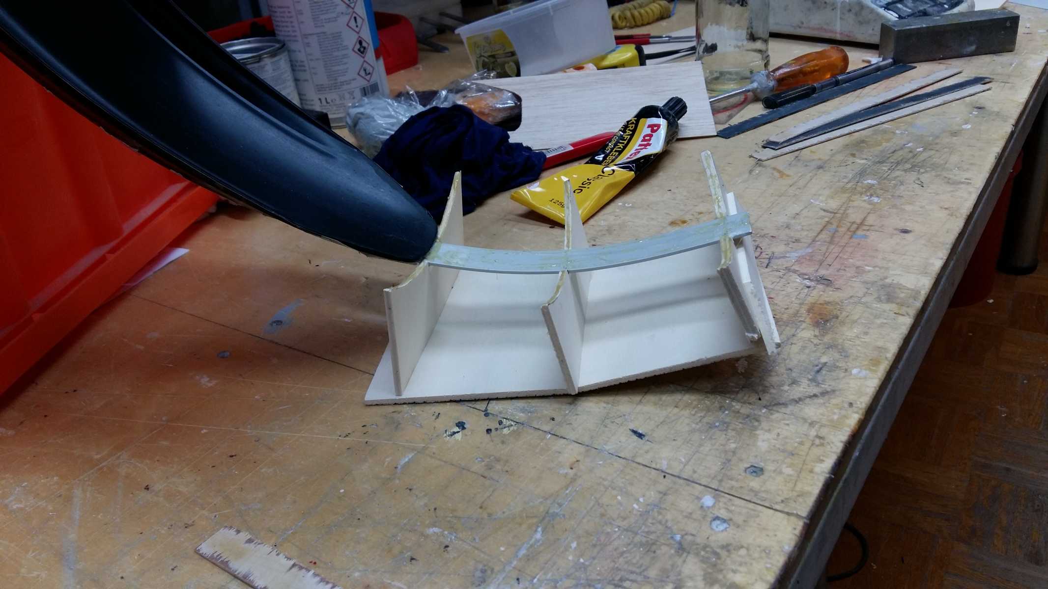 Dieses "Gerüst" wurde dann mit dünnen Sperrholzstreifen beplankt, die auch bis in den oberen Kotflügelbereich verlängert wurden, um eine etwas größere Breite des Teils zu erreichen: