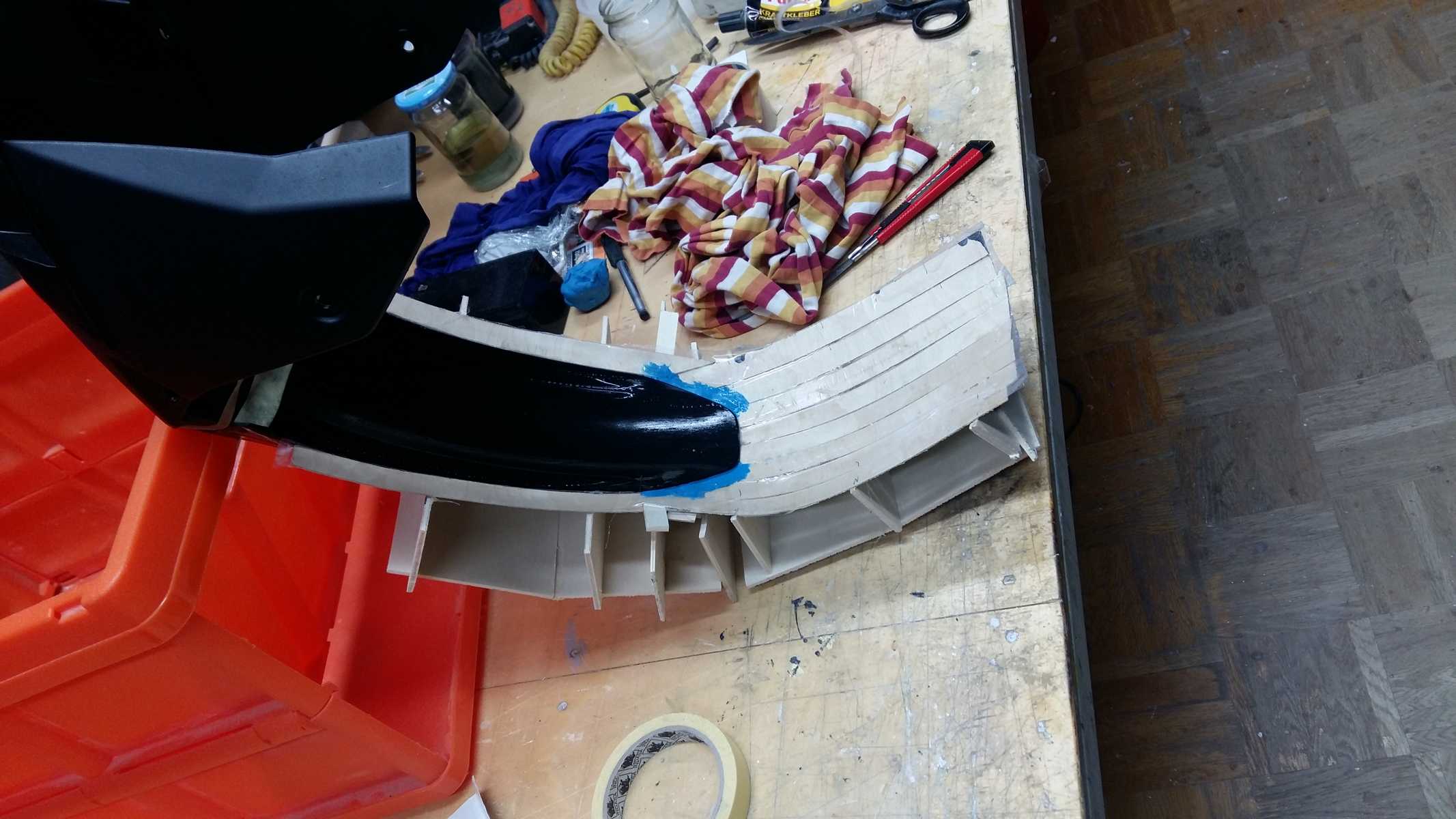 Auf diesem Aufbau habe ich dann mit Epoxydharz und Glasgewebe sehr dicke Lagen laminiert, um eine Grundlage für ein Urmodell zu bekommen, dass dann nach der Entformung so aussah: