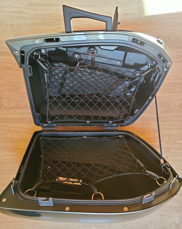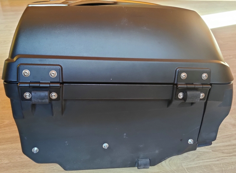 Die Klemmböcke habe ich mit 4mm M-Schrauben, Unterlagscheiben und Stoppmuttern befestigt. Dazu habe ich einfach passende Löcher (3,5mm) gebohrt. Die meisten der neu gesetzten Schrauben konnte ich von aussen unsichtbar hinter Kunststoffteilen bzw. im doppelt geführten Bereich des Bodens (wo auch die Scharniere sitzen) verstecken. Lediglich am Boden sieht man einige der neuen Schrauben und eine geht durch die Rückwand zum Motorrad hin. Bei normaler Betrachtung (von vorne, hinten, oben, seitlich) sieht man aber nichts.