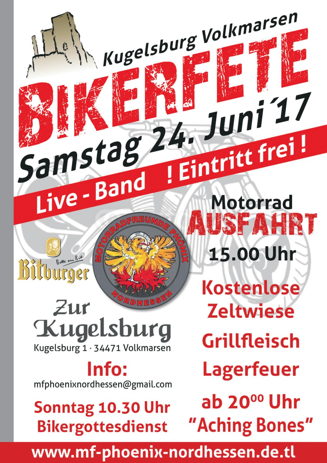 Wir, die Motorradfreunde Phönix Nordhessen, veranstalten am 24.06.2017 eine Bikerfete auf der Kugelsburg in Volkmarsen mit großer Ausfahrt am Nachmittag. Abends spielt die Live Band Arching Bones, am Lagerfeuer gibt es leckeres vom Grill und natürlich auch kühle Getränke.