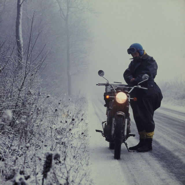 Hier ein Bild mit meiner damals nagelneuen HONDA CL 450 über Glatteis auf dem Weg zum Elefantentreffen am Nürburgring( nix Griffheizung! )