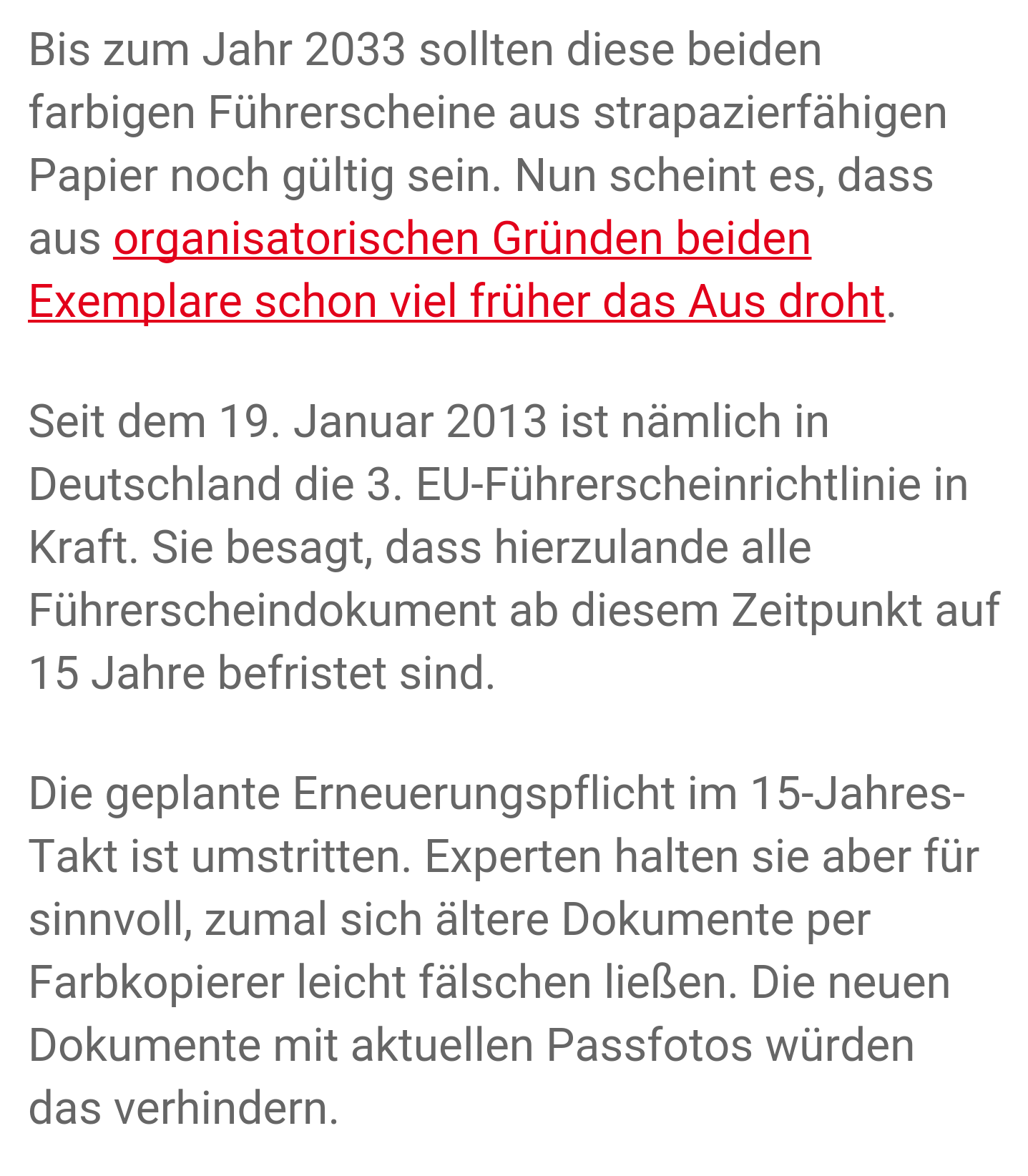 So wie es aussieht, hat man sich (vorbehaltlich der Zustimmung des Bundesrates) auf eine Prozedur geeinigt, nach welcher Führerscheine, die vor dem 19.01.2013 ausgestellt worden sind, bis zum 19.01.2033 umgetauscht werden sollen. Es wird unterschieden zwischen den alten Papierführerscheinen und den alten Scheckkartenführerscheinen, welche es ab dem 01.01.1999 gab.