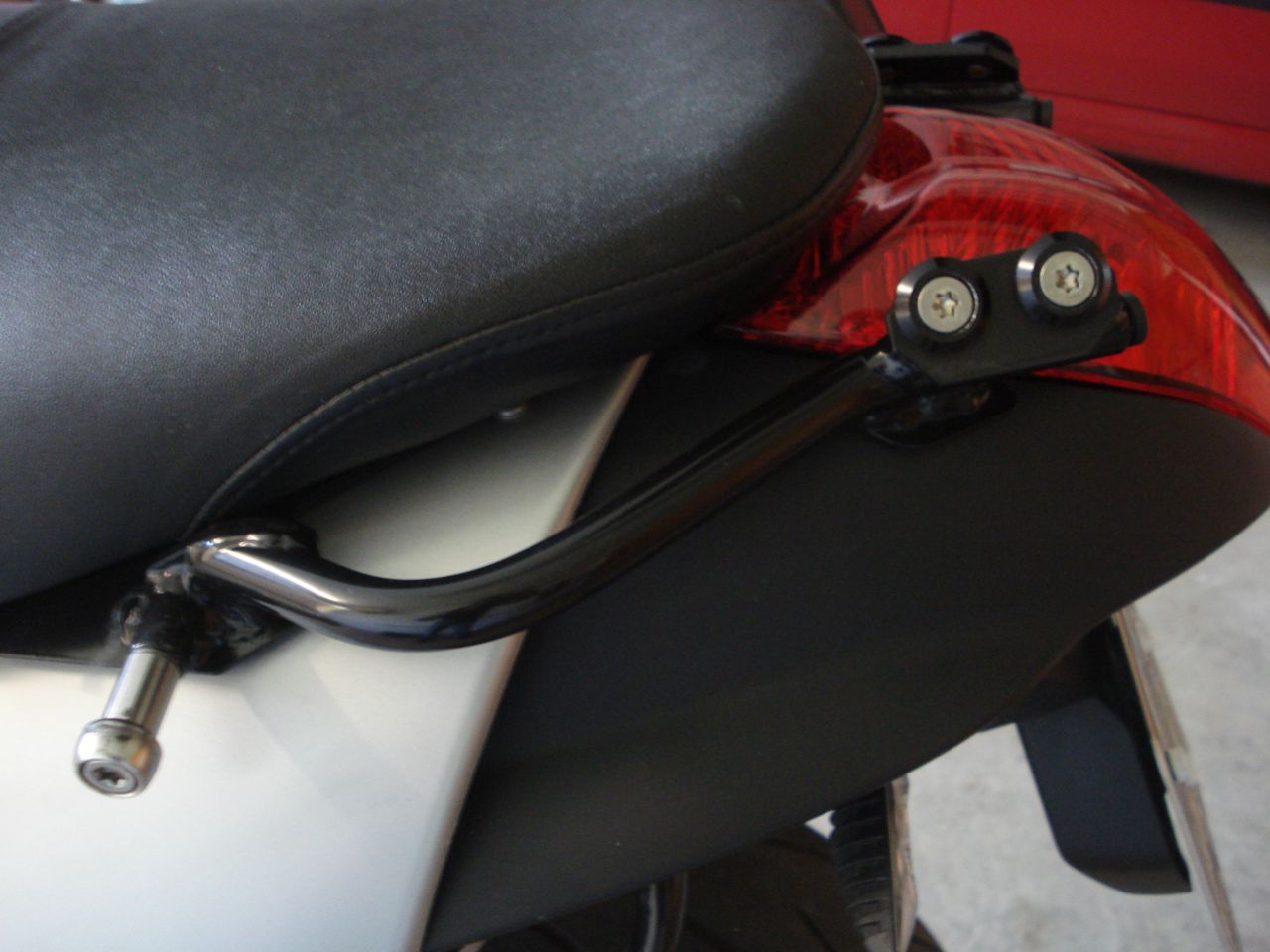 Die original Haltegriffe wurden gegen die Griffe des Topcase Halters ausgetauscht. Die Halteplatte, auf welche die Adapterplatte montiert wird, habe ich abgeschraubt. Ich finde das sieht dann nicht so störend aus. Zur weiteren Verbesserung des Aussehens habe ich die original Schrauben gegen Torx ersetzt und deren Länge so angepasst, dass sie mit der Halterung bündig sind.