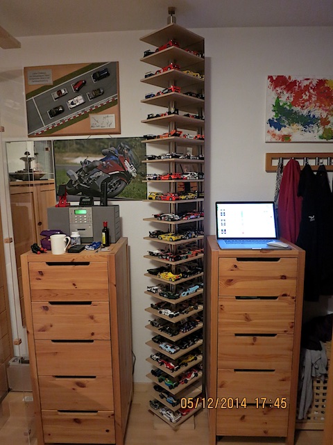 Also hab' ich jetzt meine selbstgebaute Holzrennbahn ( Slots auf CNC-Fräsmaschine in 22mm MDF-Platte eingefräst und wasserstrahlgeschnittene Stahlstromleiter eingeklebt ) zwecks besserer und schnellerer Erreichbarkeit an die Decke gehängt...