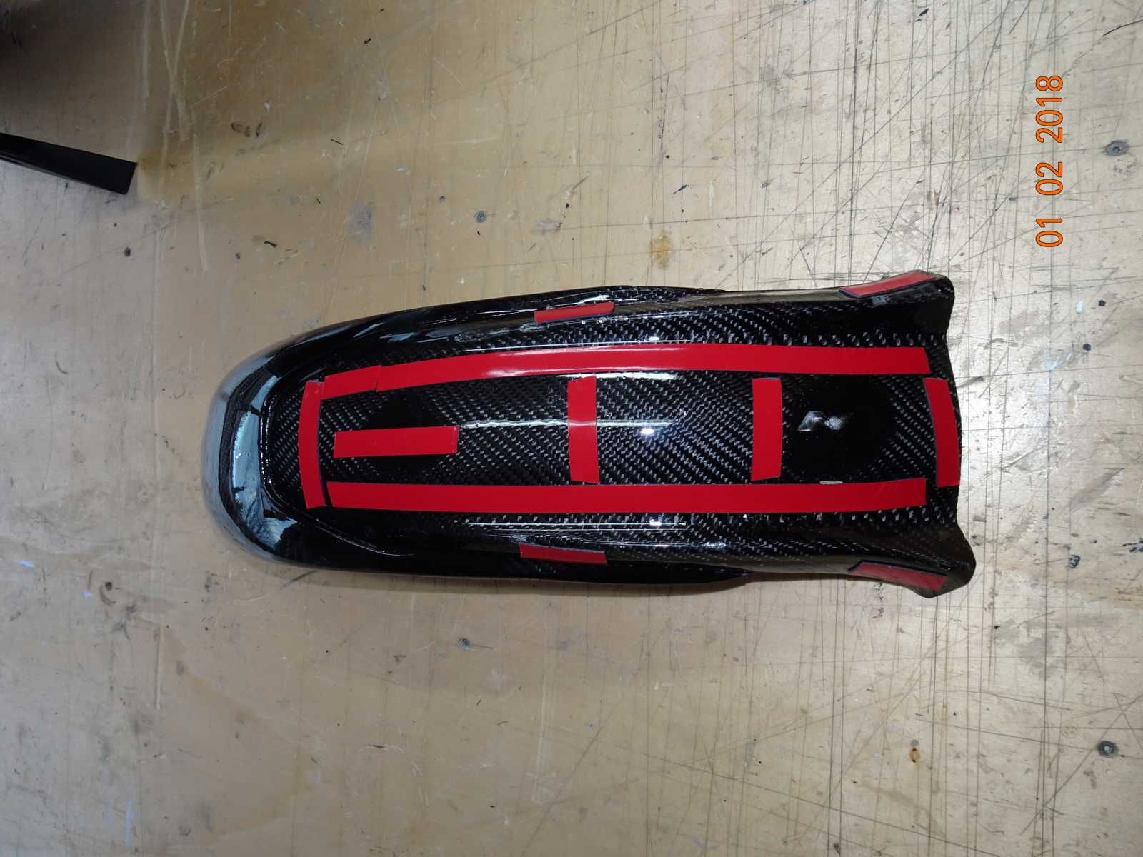 Da sie - wie beschrieben - komplett aus Carbon ist, ist sie sehr leicht (weniger als 180g), trotzdem extrem stabil und verwindungssteif. Ich habe sie bewußt so lang erstellt, damit sie gut in den beiden Sicken rechts und links des Kotflügels anliegt und dadurch eine gute Verbindung zum Kotflügel bekommt.