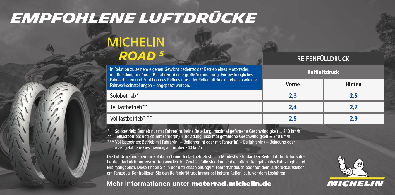 Eine Luftdruckempfehlung für den Michelin Road 5 für Solobetrieb und Betrieb mit wenig