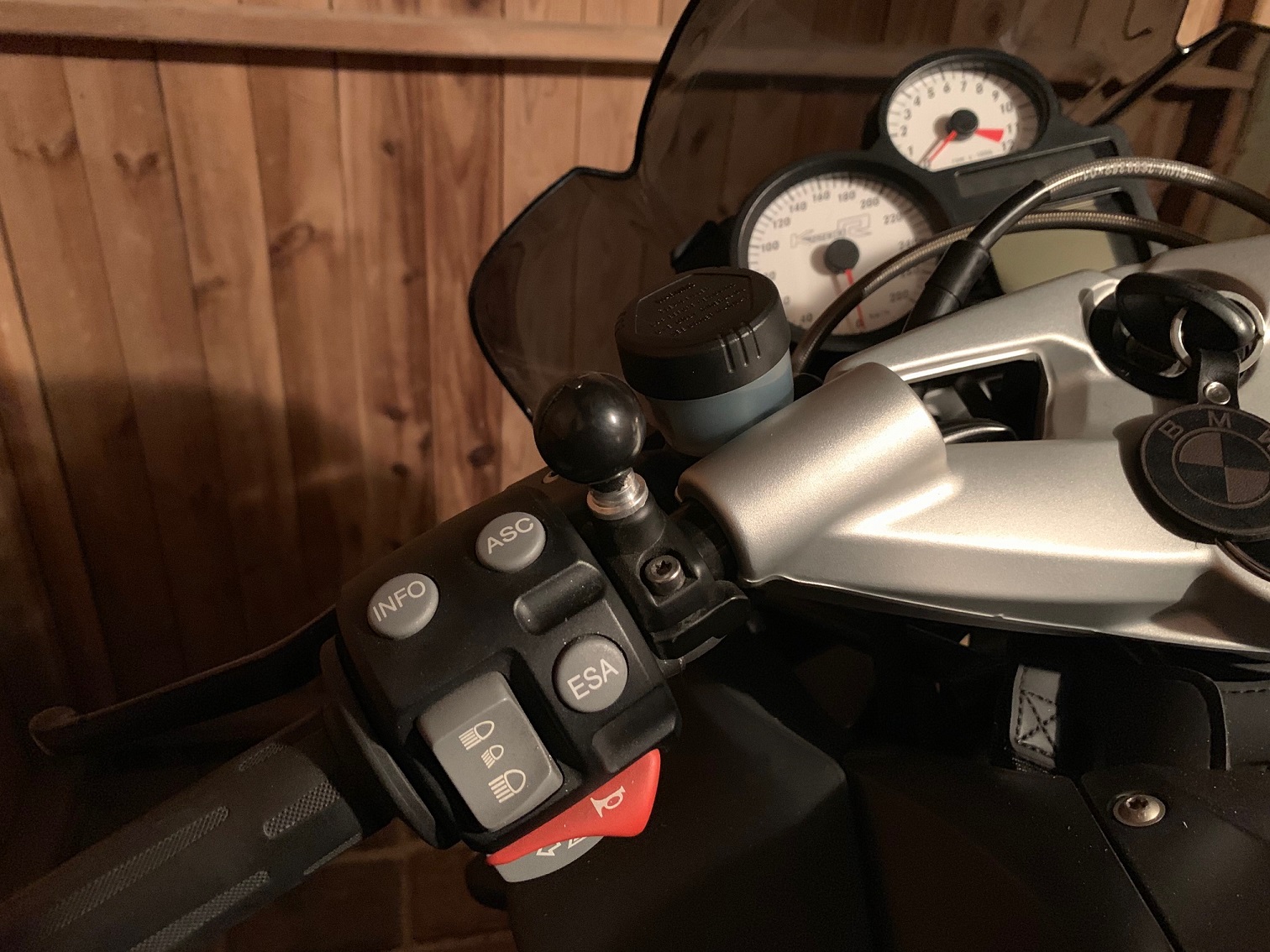 Nachdem ich nun diverse Aufnahmen einer RAM-Mount-Kugel-Halterung für meine K1200R bestellt, getestet und frustriert wieder zurückgeschickt habe (meist aus optischen Gründen), habe ich durch intensive Recherchen hier im Forum die für mich optimale Lösung gefunden.