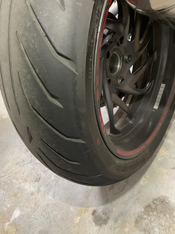 Durch Zufall hatten wir vorher noch mal das Reifenprofil,gemessen und hinten waren es bis zur Verschleissgrenze überall so um die 2,5mm und vorne 1,8mm. Der Reifen ist ein Angel GT und die Maschine eine 1300R.