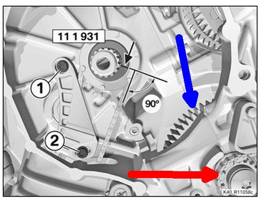 Wie du auf dem 2. Bild vom K40 Motor sehen kannst, ist da kein kleines Zahnrad! Der rote Pfeil kennzeichnet den Kurbelwellenstumpf vorn mit dem Steuerkettenantriebsritzel und der blaue Pfeil, das Zahnrad dahinter (eindeutig sichtbar - auf der Kurbelwelle- ) welches die Kupplung antreibt. Und auf diesem großen kurbelwellenfesten Zahnrad sitzt der Kupplungskorbantrieb FEST drauf.