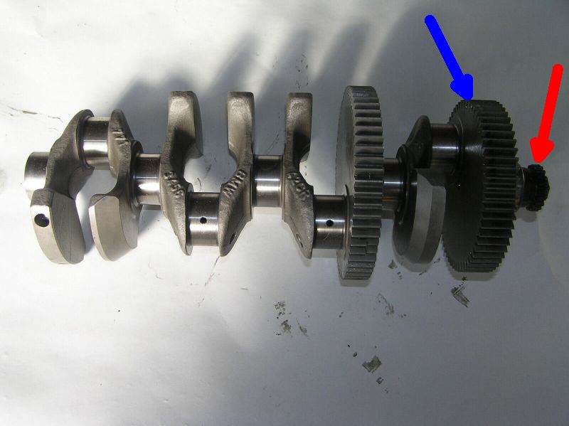 Hier siehst du die Kurbelwelle nochmal in Natura und auch das Zahnrad (blauer Pfeil), welches die Kupplung antreibt.
