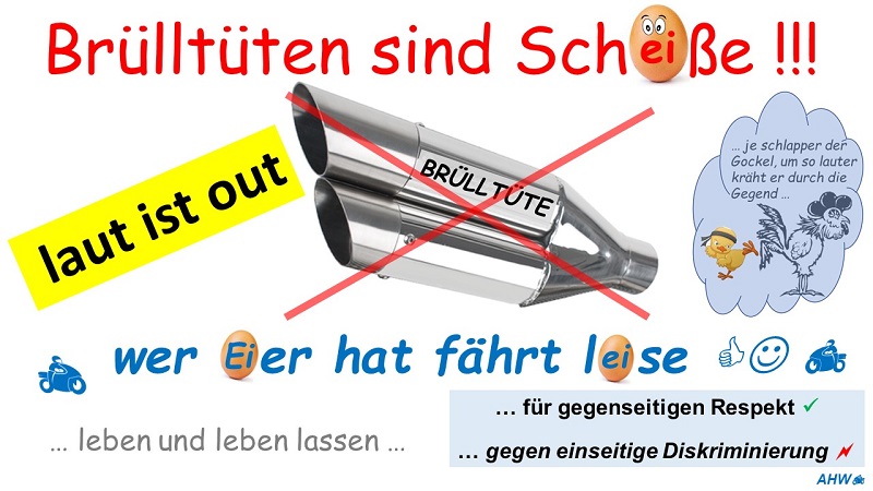 Aber da diese „Prolos“ durch ihren Schwachsinn und den daraus verursachten Restriktionen rücksichtslos egoistisch dem großen Rest von uns Biker*innen Schritt um Schritt sowohl unser Hobby und unser Image versauen, tendiere ich eher zu einem klaren und verachtendem „kickass“ diesen Schwachköpfen gegenüber.