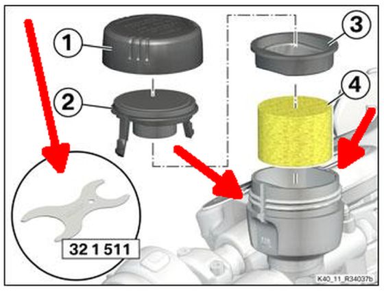 Dafür gibts ein Werkzeug, welches 2 Plastiknasen (die Deckel festhalten) reindrückt, siehe Bild. Und wenn man nicht weiß, wie das geht, dann schaut man sich im Internet ein Bild von dem Ding an (OHNE Deckel) und schon wird klar -WIE! :D Bilder gibts z.B. in der Bucht, wo jemand solch einen Behälter verkaufen möchte, oder bei Kleinanzeigen oder im OEM Katalog. ;-) Seid doch mal kreativ :lol: