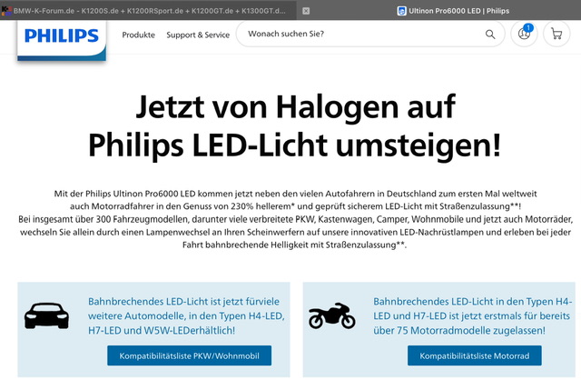 bigsmartchopper hat geschrieben:…nö, aber PHILIPS bietet seine >H7 LED pro6000< für immer mehr BMW legal an. Leider ist die K12/K13 noch nicht auf der Liste.
