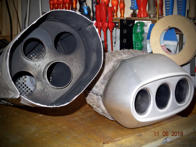 Der Schnitt erfolgte exakt nach der letzten Dämpferkammer - von dieser aus gibt es nur das abgesägte Restvolumen, welches die beiden an der Schalldämpferleistung fast unbeteiligten Endrohre aufnimmt, sowie das eigentliche Endrohr, das in den Hauptdämpfer eingesteckt ist...