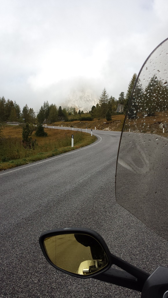 Anzumerken sei noch, da ich gerade in der Gegend von Cortina d'Ampezzo im Regen unterwegs bin, die Scheibe sich auch dabei gut fahren läßt. Entwerder du läßt sie ganz heruntergefahren oder stellst sie ganz hoch. Man muß zwar dann durchschauen, aber das Wasser wird dann gut abgeleitet und kommt weniger Regen auf den Helm und Körper.