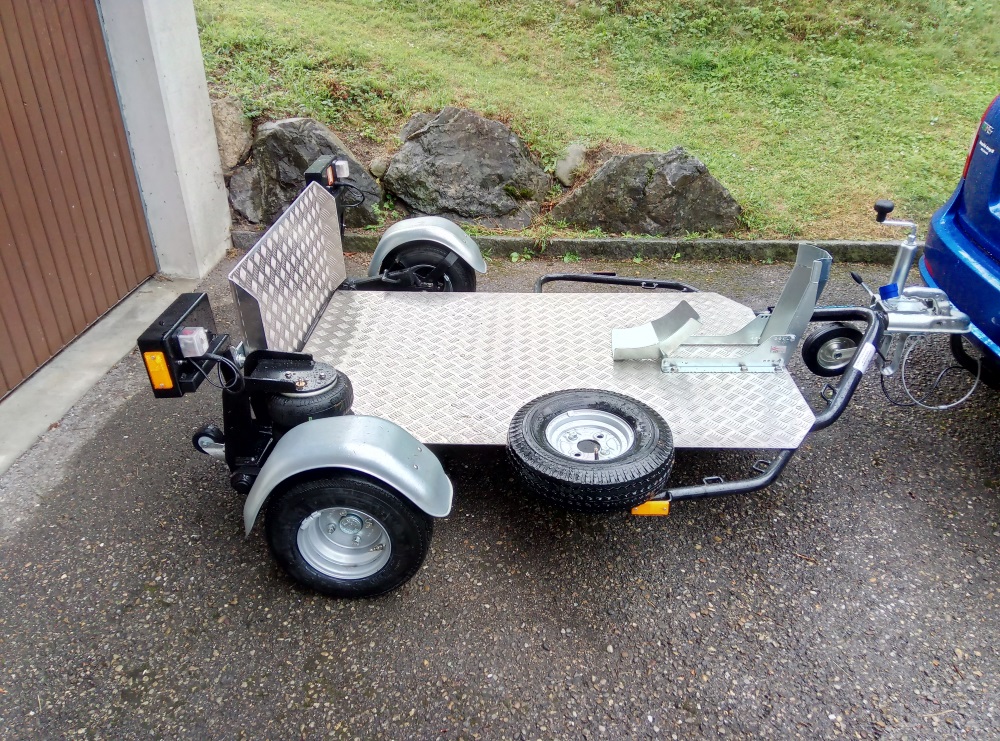 Kaufe dir für kleines Geld einen HP 500 (leichter alter DDR-Anhänger) - der hat eine Auflaufbremse und Federung und ist somit für 100 km/h zulassungsfähig - baue dir die Ladefläche um, oder entferne sie ganz. Nimm dir eine lange Auffahrschiene und schon flutscht das ganz einfach. Wenn du zusätzlich bequem neben dem Mopped beim beladen hergehen möchtest, fertige dir noch eine klappbare oder feste Plattform aus Riffelblech dazu an. Danach besorgst du dir noch zwei runde Bügel. (Er hat schon zwei Rohre in die man die ggf. stecken kann), befestigst diese neben den Rückleuchten und schon kannst du den Anhänger ganz darüber rollen und somit an die Wand stellen. Sollte die Deckenhöhe das nicht hergeben so baue dir noch einen breiten Holzkeilständer (unter den u.U. sogar noch das Auto fahren kannst).