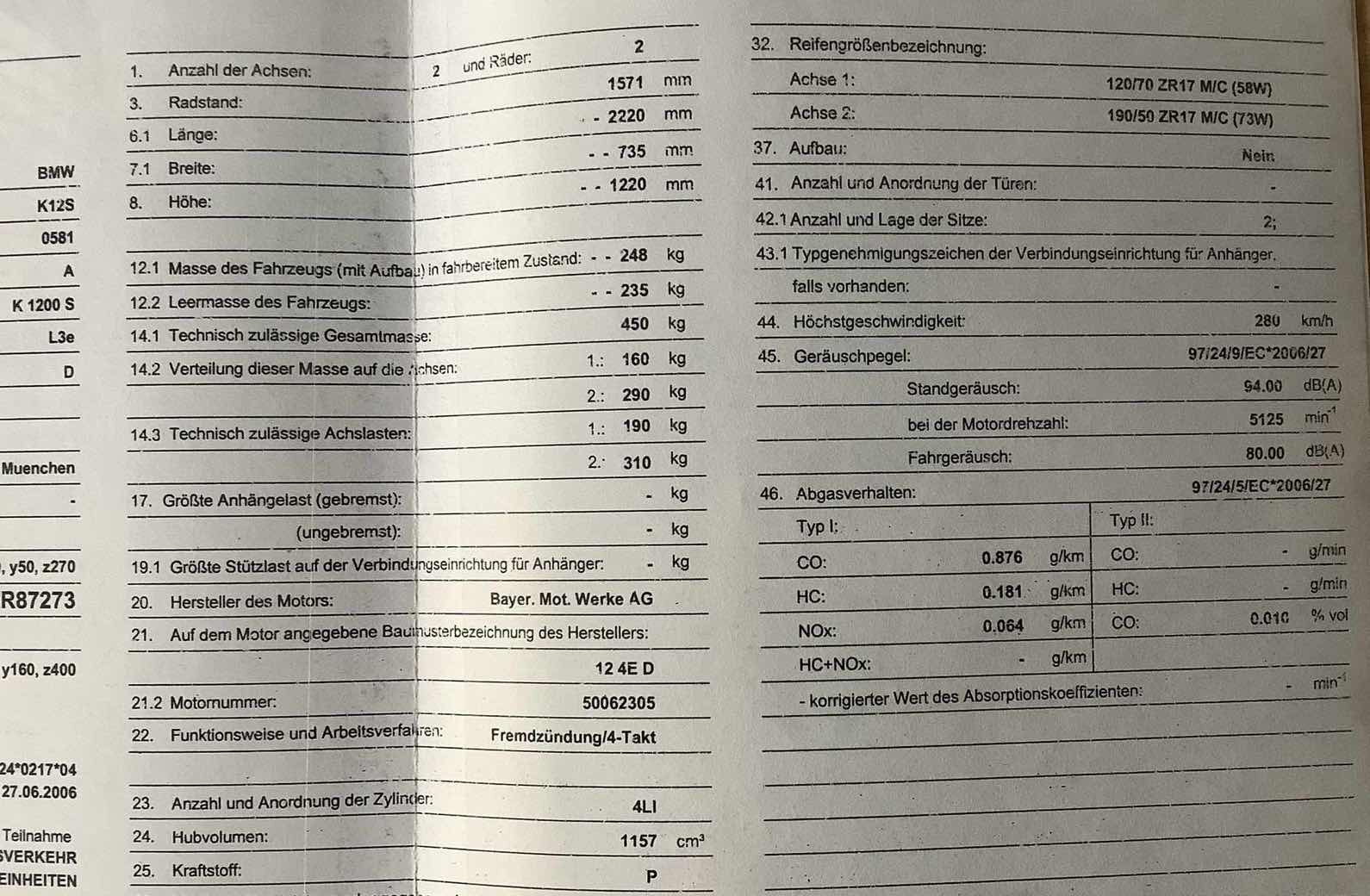 [quote="BMW-Frank"]Ich will euch ja jetzt nicht die Illusion nehmen, aber bei der K1200 steht das mit der Reifenfabrikatsbindung im Feld 50 COC Bemerkungen.