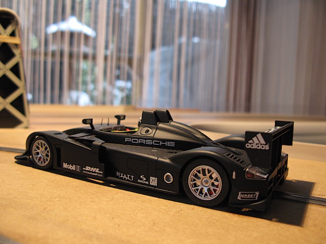 Also hab' ich jetzt meine selbstgebaute Holzrennbahn ( Slots auf CNC-Fräsmaschine in 22mm MDF-Platte eingefräst und wasserstrahlgeschnittene Stahlstromleiter eingeklebt ) zwecks besserer und schnellerer Erreichbarkeit an die Decke gehängt...