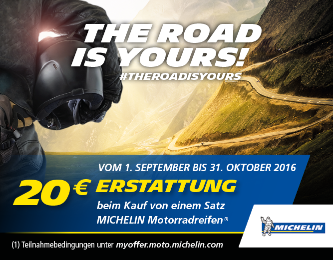 20,-€ als Tankgutschein oder Geldüberweisung (nach Wahl) beim Kauf eines Satzes MICHELIN Power SuperSport Evo, MICHELIN Pilot Power 3 oder MICHELIN Pilot Road 4 (Standard, GT oder Trail)