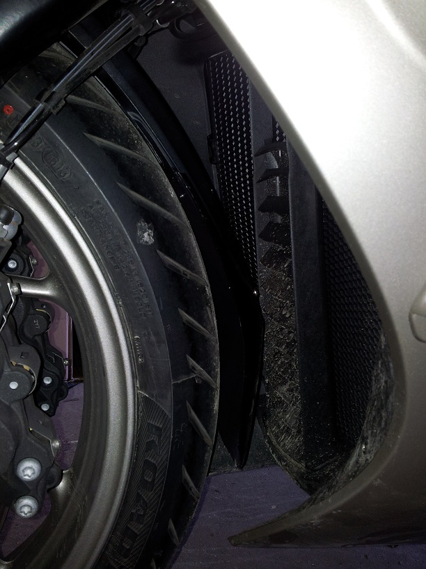 Ich hatte auch eine Kotflügelverlängerung aus Carbon (wird heute noch in der "Bucht" angeboten). Diese hat während der Fahrt erhebliche laute Schlaggeräusche erzeugt, da der Abstand zwischen dem Bauteil und dem Reifen extrem eng ist. Außerdem ist der Originalfender sehr labil. Die Folgen waren laufende Berührungen mit dem Reifen. Da das Ende der Verlängerung entgegen der Laufrichtung steht wurde die Unterkante messerscharf angeschliffen. Eine Beschädigung des Reifens konnte nicht ausgeschlossen werden. Der Lieferant hat mir nach meiner Bemängelung und Zusendung von entsprechenden Fotos den Kaufpreis umgehend zurück überwiesen. Das Teil durfte ich behalten.
