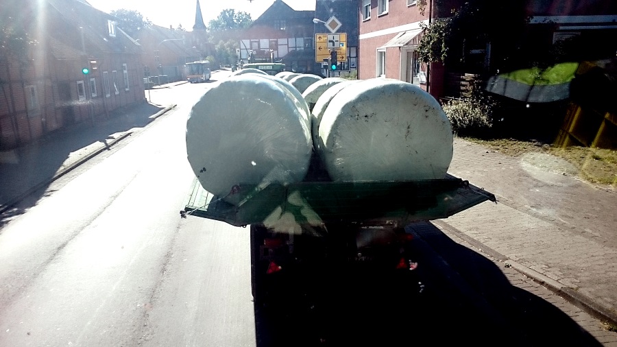 an der Kreuzung in Ehra steht dann sowas. Trecker mit 2 Ladewagen auf denen die