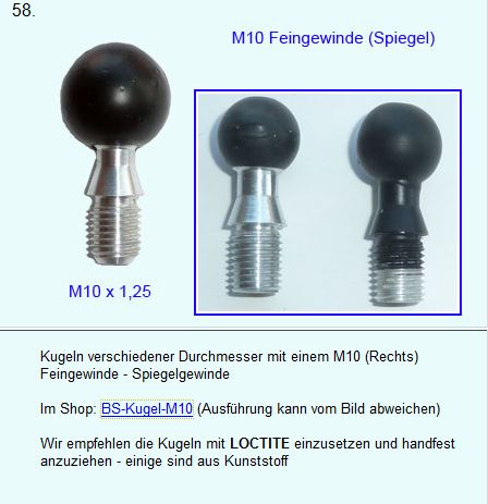 Könnt Ihr mir sagen, ob die Spiegelaufnahme bei der K1200R irgendein spezielles Gewinde ist oder ist das was ganz normales metrisches (M8 ? M10?), damit ich mir dann bei bikertech.de die entsprechende RAM-Mount-Kugel mit passender Schraube ordern kann.